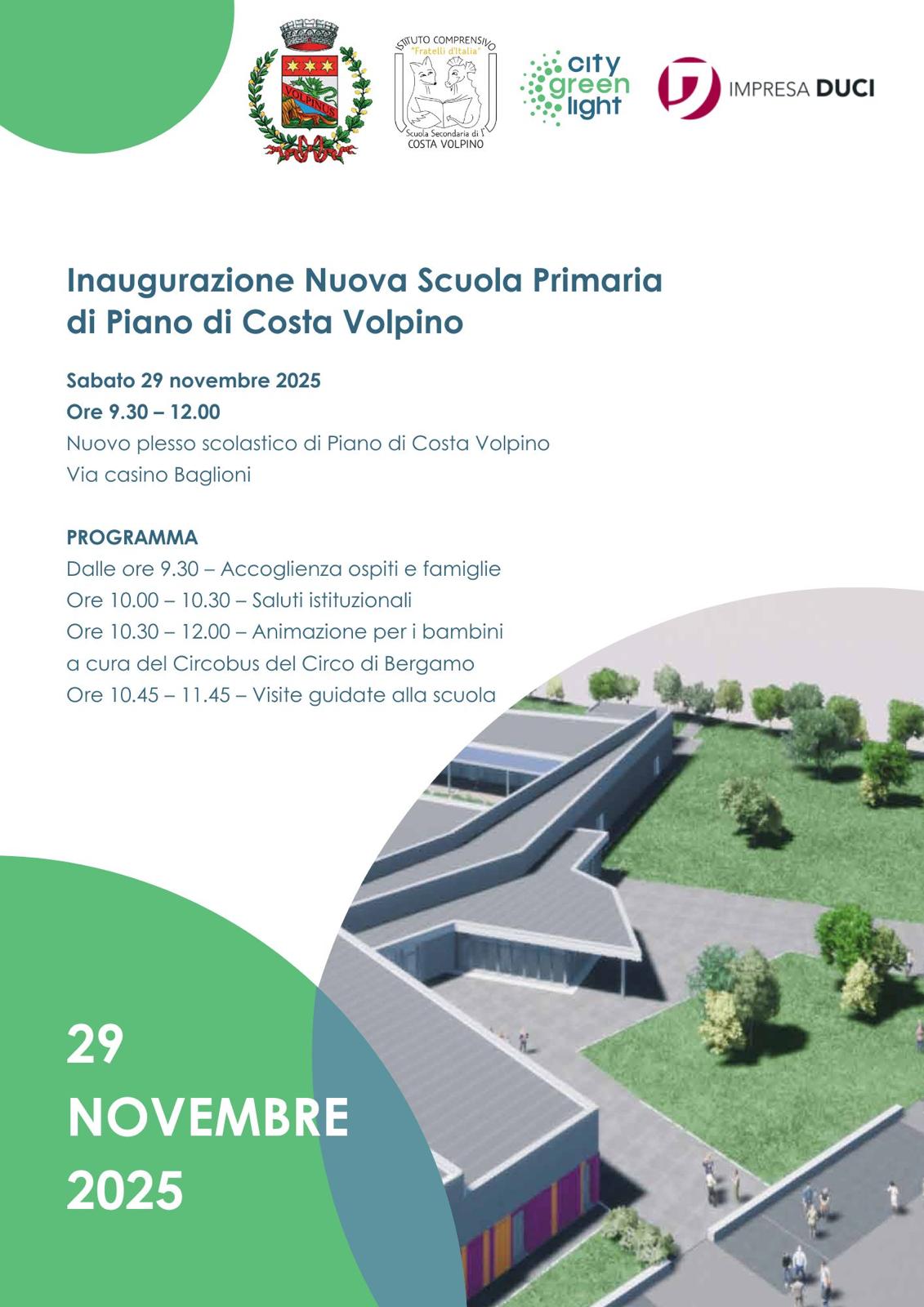Sabato 29 novembre con inizio ore 9.30 inaugurazione nuova scuola primaria di Piano- Costa Volpino